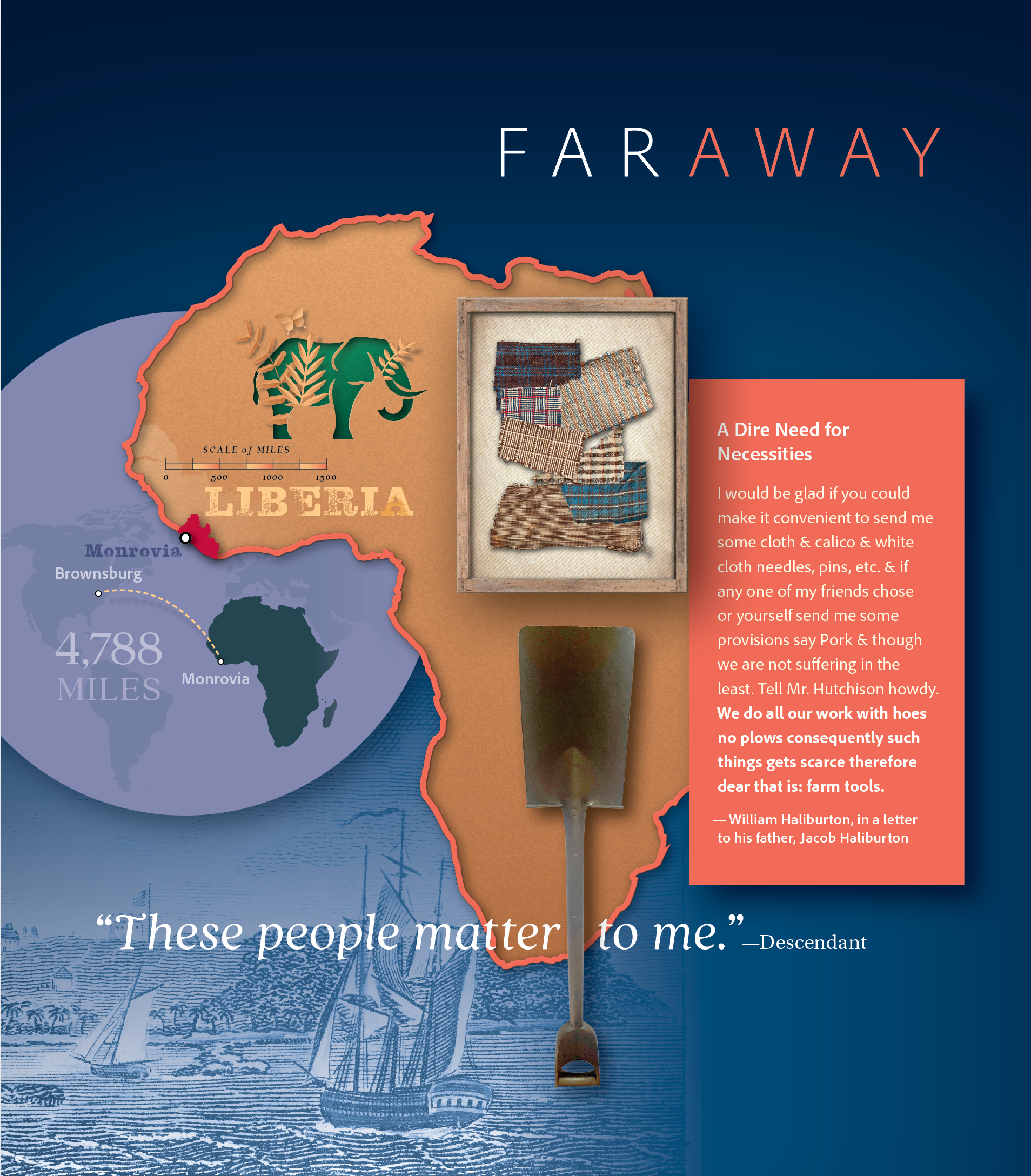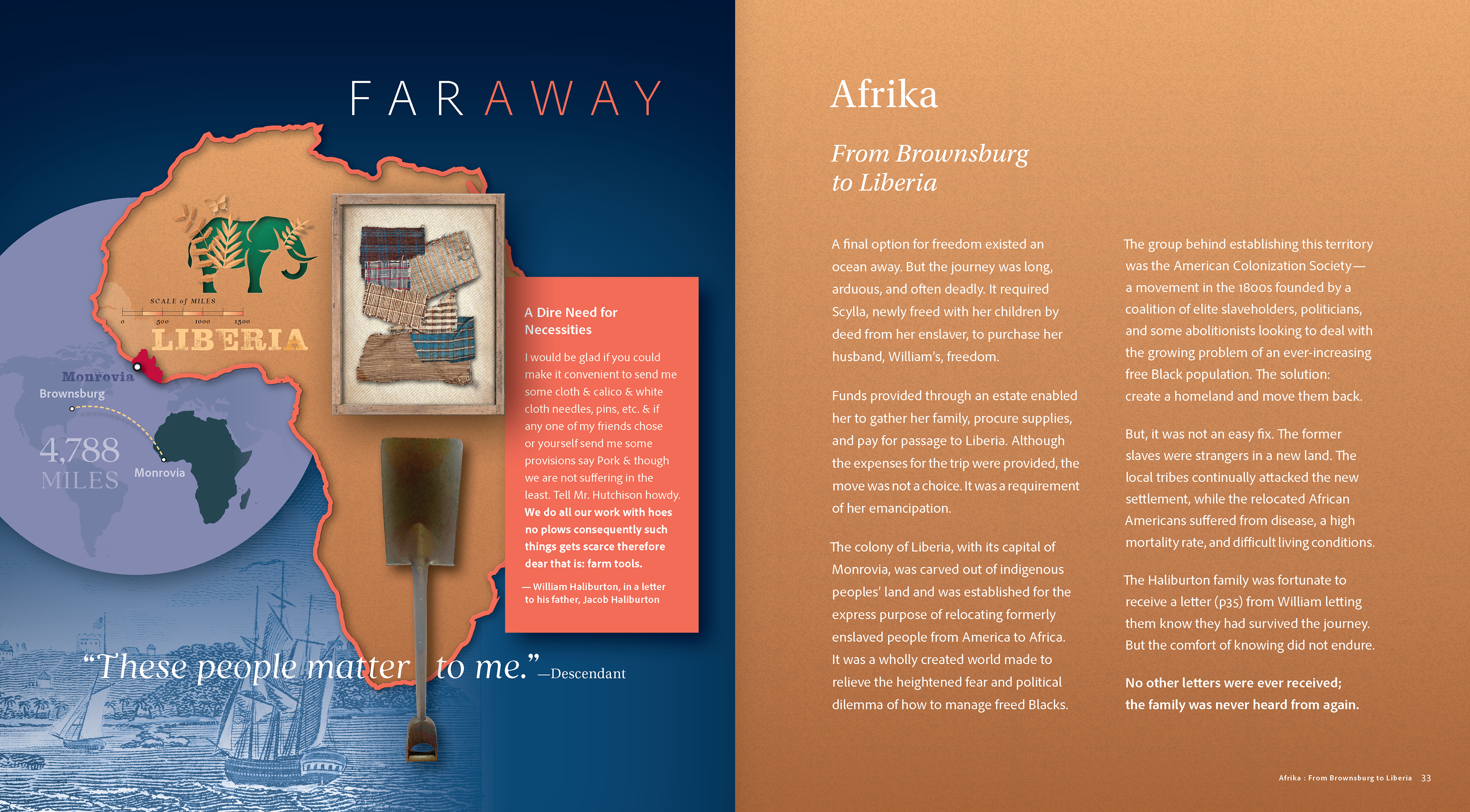 Members of the Halliburton family were enslaved in Rockbridge County, then were freed and immigrated to Liberia. An exhibit at the Brownsburg Museum traces their journeys, struggles and triumphs explores the history of enslaved ancestors and their descendants, weaving together family, community, and historical narratives. The exhibit features powerful photographs and stories from living descendants, aiming to provide an emotional and educational experience about the legacy of slavery in the area. The museum has been recognized for its innovative approach to history and community engagement.