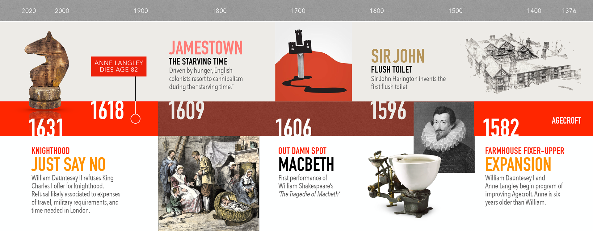 This unique infographic timeline showcases the rich history of this historic house. Beginning in the present-day lobby, visitors travel backward in time through a long corridor, with each milestone bringing them closer to the doorstep of this remarkable home, dating all the way back to 1376. The timeline also highlights parallel historic events from both England and around the world, providing a captivating context to the house’s story.