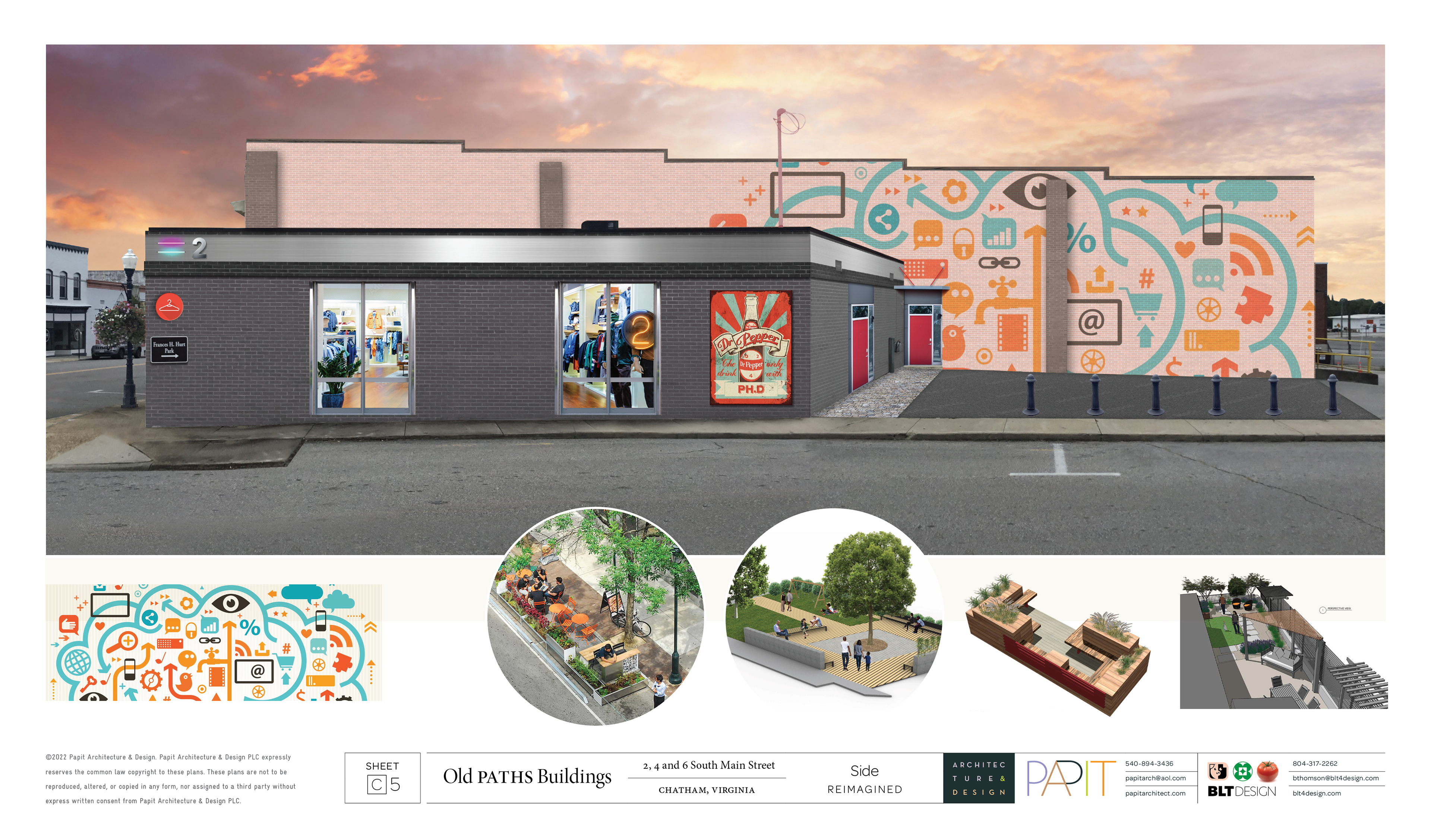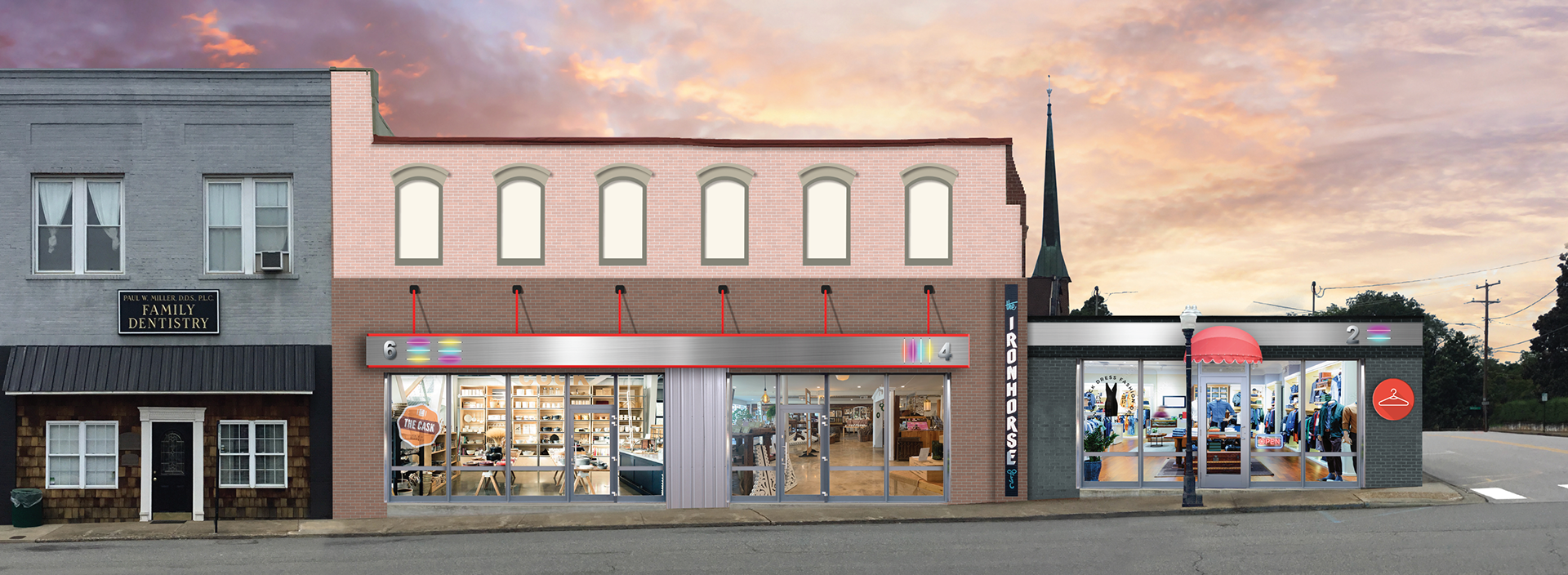How might one repurpose two underloved and vacant storefronts across the street from the county courthouse? Demonstrations created with Michael Papit of Papit Architecture and Design (one of six reimaginings shown).