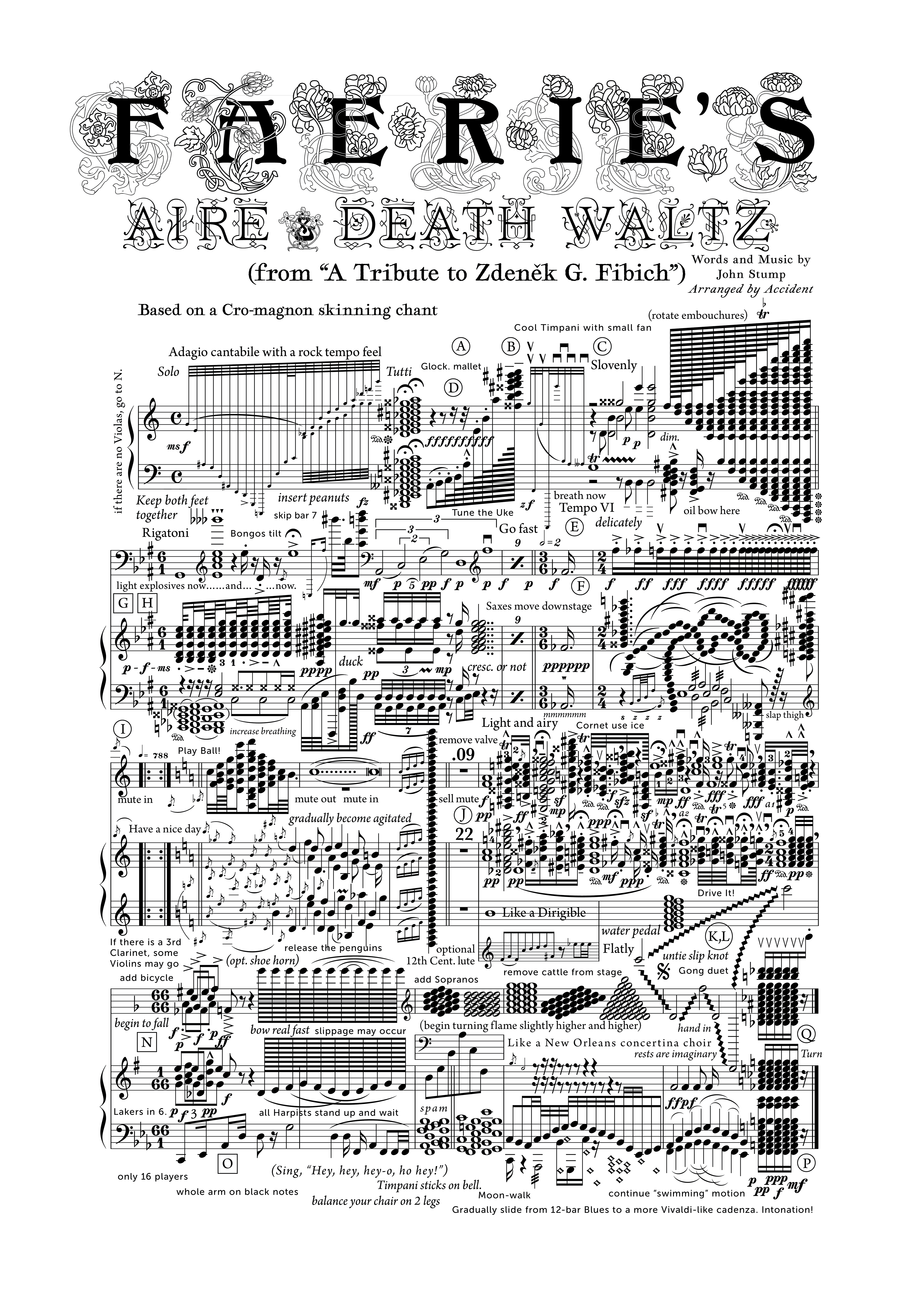 “Faerie’s Aire and Death Waltz (from ‘A Tribute to Zdenko G. Fibich’),” created by American artist John Stump, is a satirical musical composition designed to be virtually impossible to play. The score includes absurd and whimsical notations such as “release the penguins,” “like a dirigible,” and “gong duet.” Remarkably, despite its ridiculous demands, someone has actually performed it.